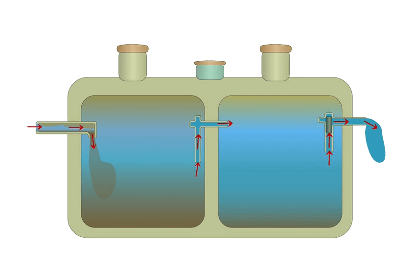 Septic tanks are hermetically sealed underground containers that can be constructed from concrete, plastic, or fiberglass. They are primarily found in homes not connected to a sewage system. They help treat domestic blackwater—wastewater from toilets that contains human waste. This type of water requires treatment before it can be safely returned to the environment. In septic systems, blackwater undergoes primary treatment through an anaerobic process, but its effectiveness is limited; it requires additional filtration or treatment to ensure environmental safety. This additional treatment system might be a leach field, also called an oxidation or infiltration field. The infiltration field receives the contaminated liquid portion of the blackwater and treats it through natural processes such as microorganisms found in the soil, filtration through the soil substrate, and plant roots that consume nutrients typically found in wastewater (nitrogen, phosphates, and their chemical compounds).